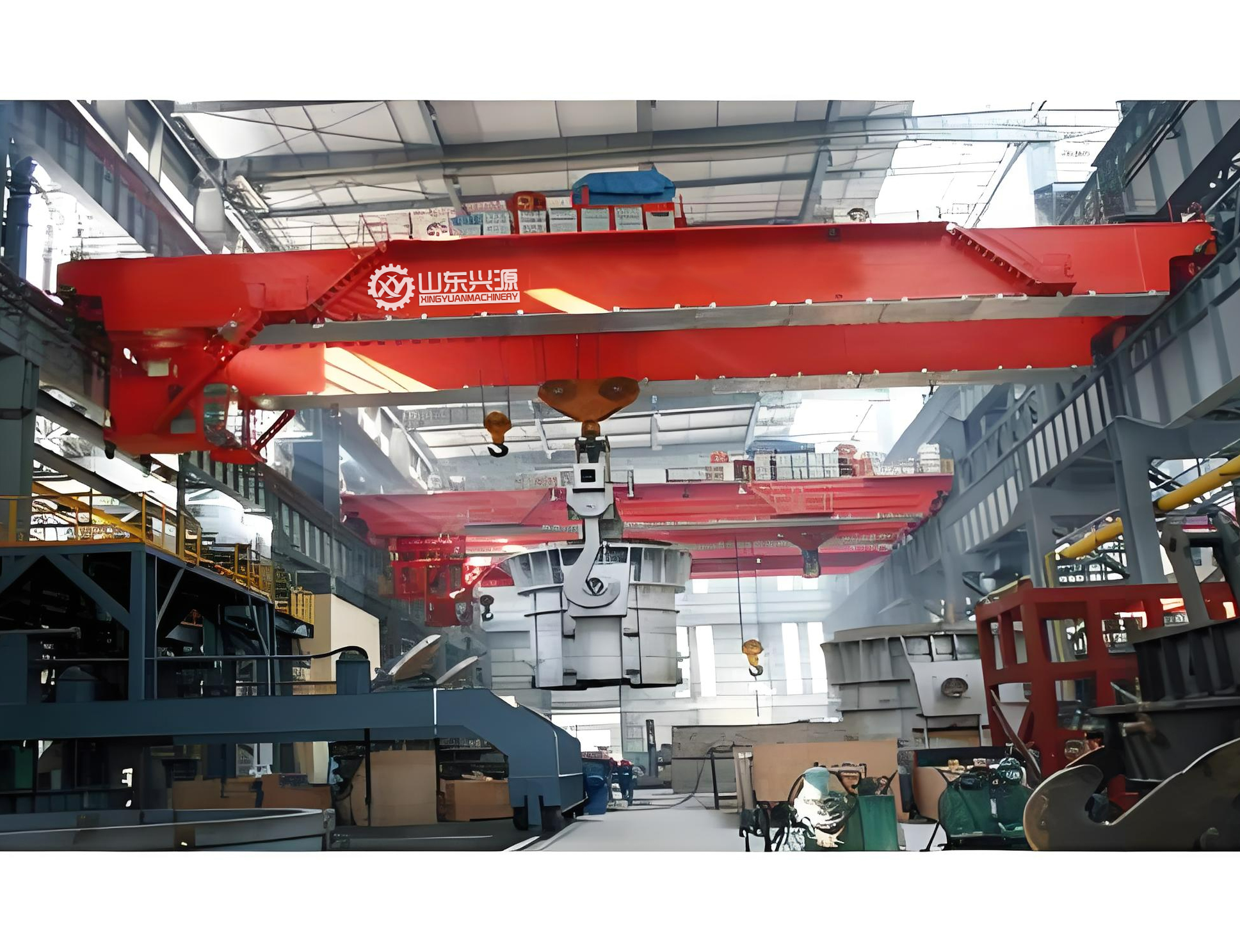 是依靠沿廠房軌道方向的縱向移動、小車的橫向移動和吊鉤的升降運動來進行工作,用于相對繁忙的冶金鑄造車間,適用于金屬冶煉、扎制和熱加工等的專用起重機